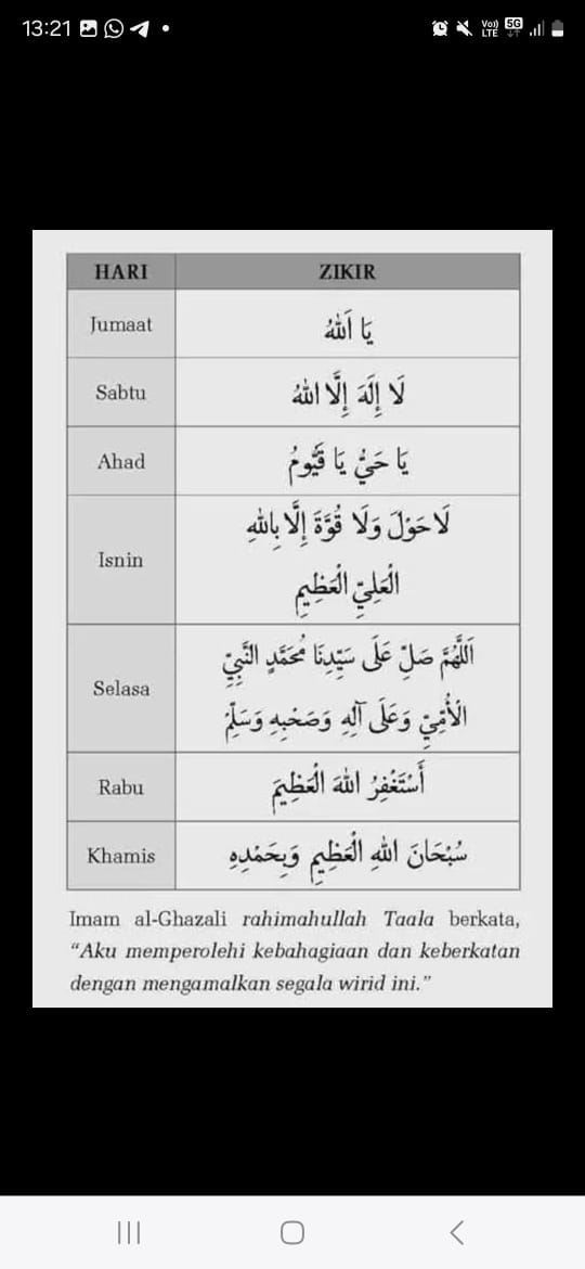 لَا إِلٰهَ إِلَّا اللَّهُ الْمَلِكُ الْحَقُّ الْمُبِينُ، مُحَمَّدٌ رَسُولُ اللَّهِ الصَّادِقُ الْوَعْدِ الْأَمِينُ (Tiada Tuhan selain Allah Yang Maha Menjadi Raja, Maha Benar, Maha Menjelaskan. Nabi Muhammad SAW utusan Allah yang Benar, menepati janji & terpercaya) 100X